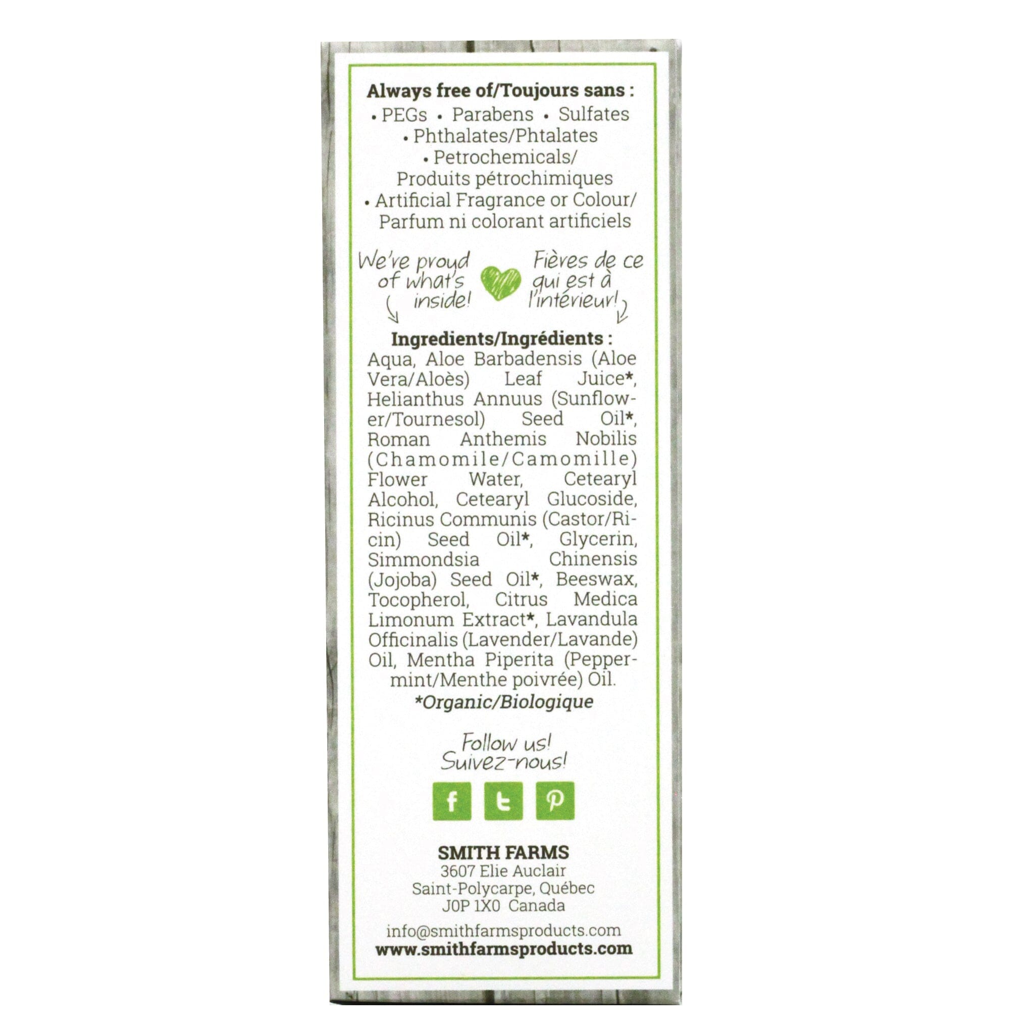 Distilled Water, Aloe Vera, Organic Sunflower Oil, Chamomile Water, Organic Cetearyl Alcohol (and) Cetearyl Glucoside (plant sugar derived emulsifier), Organic Castor Oil, Vegetable Glycerin (Vegetable), Organic Jojoba Oil, Vitamin E, Beeswax, Organic Citrus Extract (preservative), Lavender Essential Oil, Peppermint Essential Oil.